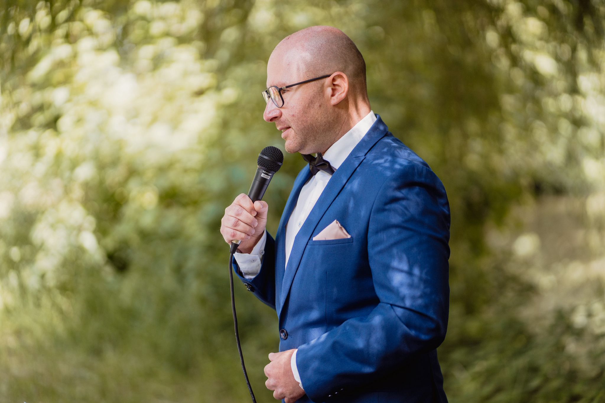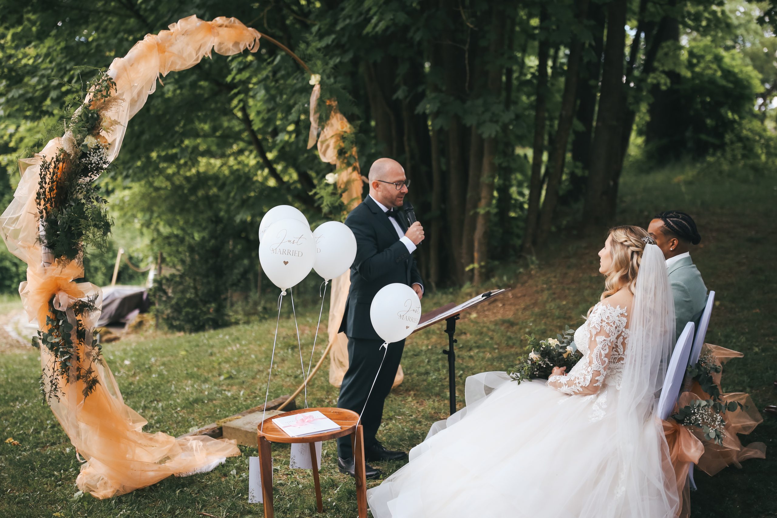 “Durch unsere gemeinsame Freundin und Trauzeugin lernten wir uns kennen und es war sofort klar, dass du uns trauen wirst. Durch Corona mussten wir unsere Hochzeit um ein Jahr verschieben. Dabei standest Du uns immer mit Rat und Tat zur Seite und fandest immer eine Lösung. Wir saßen zusammen, um Dir unsere Geschichte zu erzählen. Du bist einfühlsam und detailverliebt vorgegangen, sodass wir sofort wussten, dass du mit Herz und Leidenschaft bei der Sache bist. Nun durften wir endlich unseren großen Tag feiern und du hast unseren Erwartungen noch einen drauf gesetzt ! Deine Rede war so schön, emotional, lustig und berührend, sodass wir noch ewig dran zurück denken werden. Lieber Manu, vielen Dank, dass du den wichtigsten Teil dazu beigetragen hast, dass dieser Tag so wundervoll für uns geworden ist.”